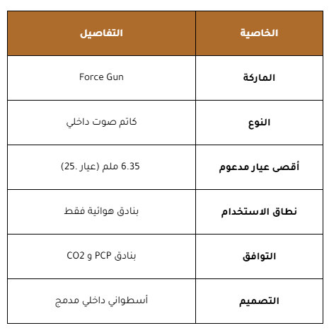 كاتم بندقية هوائية احترافي من Force Gun مصمم لتقليل صوت الإطلاق بكفاءة عالية. يعتمد على كاتم صوت داخلي بنواة مثقبة تعمل على تشتيت ضغط الهواء، مما يجعله خيارًا مثاليًا للصيد الهادئ والرماية الآمنة مع البنادق الهوائية القوية.