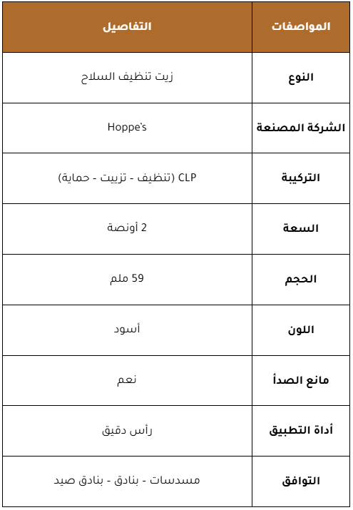يُعد زيت تنظيف السلاح Hoppe’s حلًا عمليًا للعناية بالأسلحة، حيث يجمع بين التنظيف والتزييت والحماية في خطوة واحدة. تم تصميم هذا الزيت لإزالة الكربون والرصاص وبقايا البارود بكفاءة، مع توفير طبقة حماية تمنع الصدأ وتحافظ على أداء السلاح لفترة أطول.